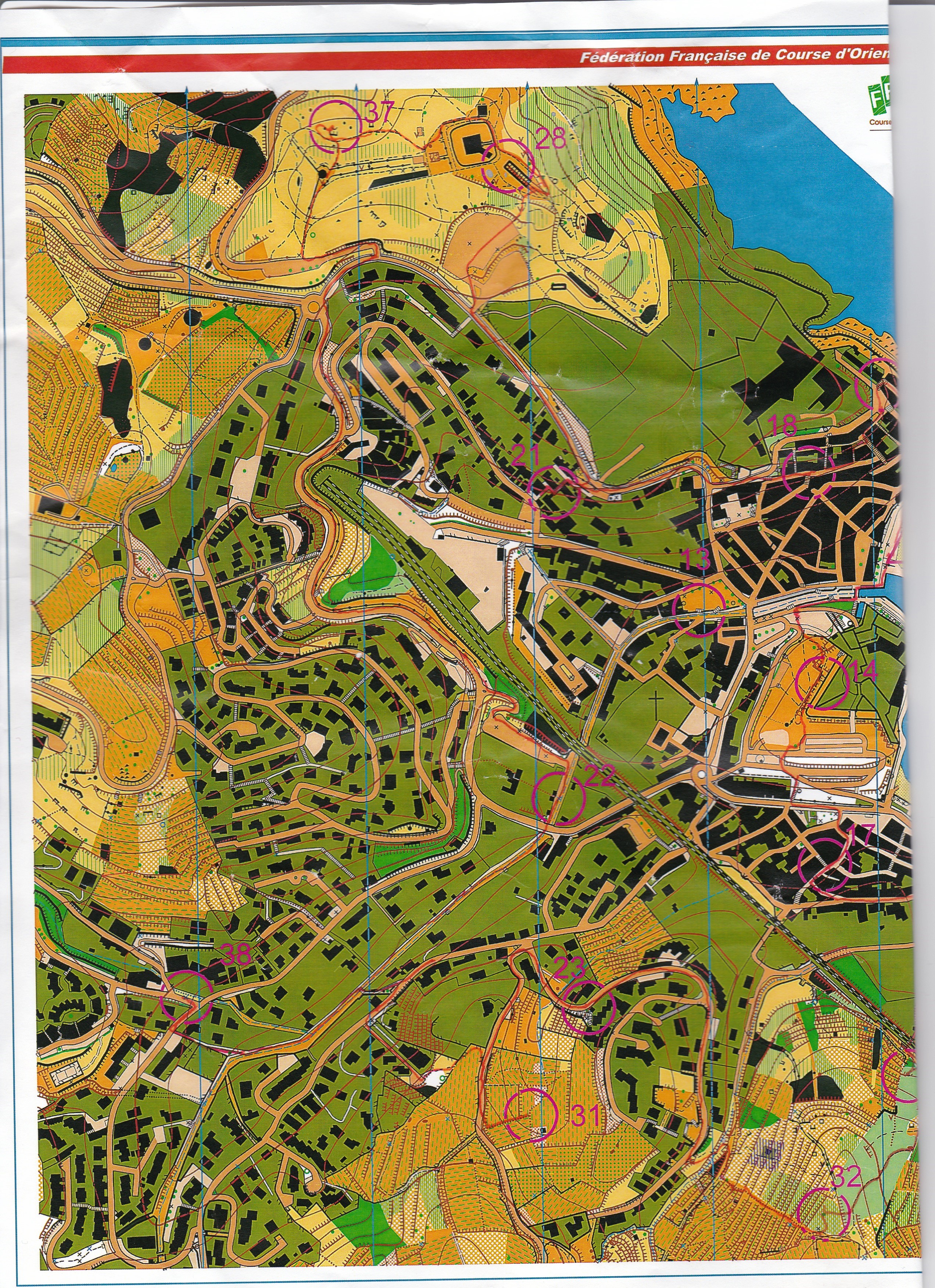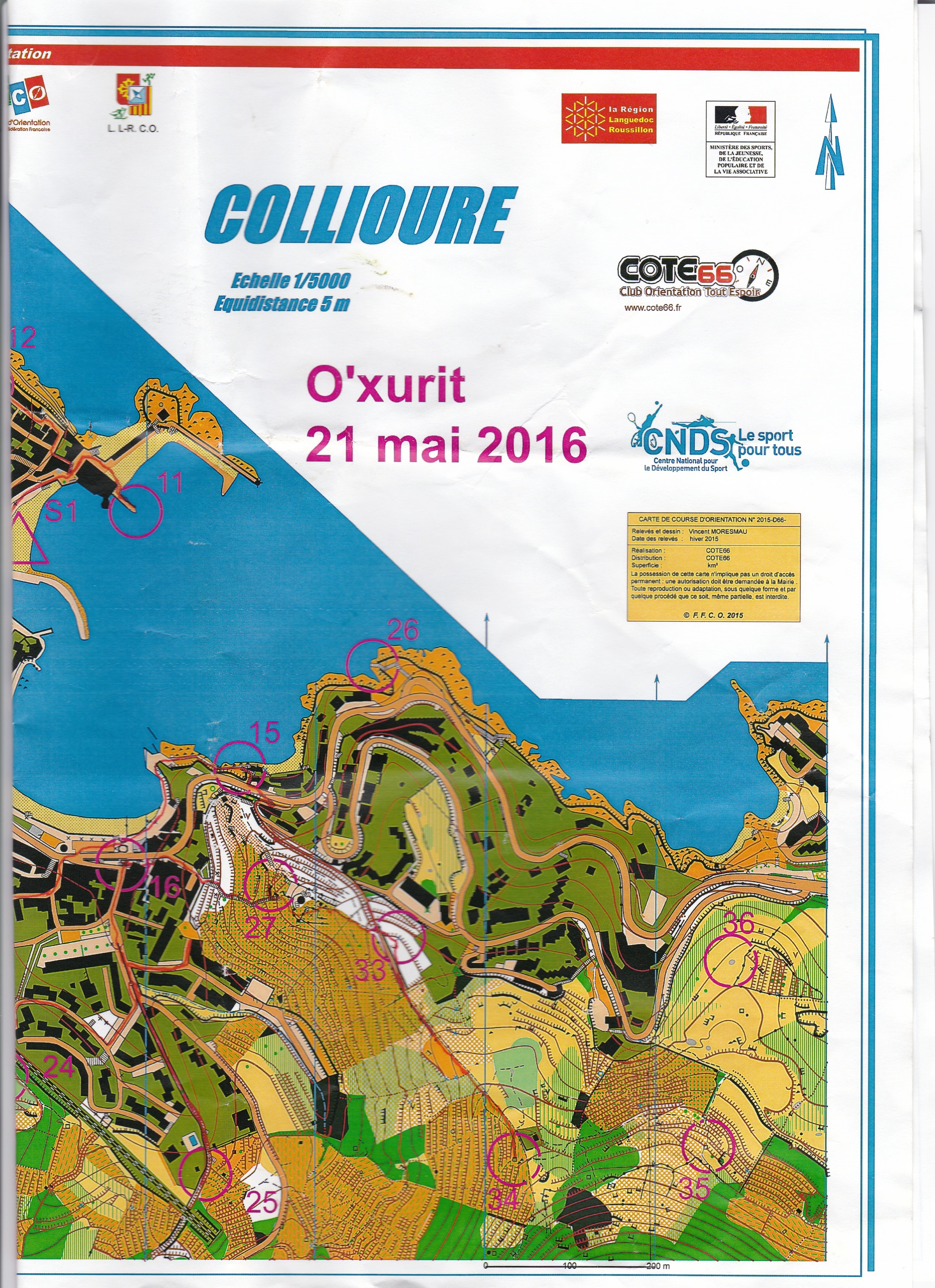 Puis retour sur mes pas le long de la rivière, rebonjour aux ânes !! puis montée par un passage sur la droite, suivre la vigne puis la route pour la 31. Pour ne pas traverser les vignes, je remonte sur la route pour faire le tour pour trouver la 23 et je continue toujours sur la route pour traverser un ruisseau par un petit chemin, prendre un chemin à droite pour monter la colline en bord de vigne : il fait très chaud et ça monte dur. Arrivé, en haut, je dois contourner une zone de ronces pour chercher l’arbre et la balise 32. je redescends par le chemin pour aller à la 24 tout en réfléchissant à la suite. Pour la 25 il y a un passage sous la voie ferrée par une ravine, mais cela ne me semble pas très net. Je préfère assurer et donc je passe sous la voie ferrée à gauche de la 24 et je traverse un ensemble d’immeubles pour descendre dans la ravine et la remonter jusqu’à la 25. Puis demi tour, pour refaire la ravine et tourner à droite pour aller sur la 27. Hélas, le portail avant un petit parc est fermé par une chaîne. Je fais donc demi tour et je passe faire la 16 pour ensuite remonter par le musée d’art moderne, monter l’escalier Ouf ! Ouf ! Pour trouver la 27. Je fais le tour du moulin à vent et vais chercher la 33 puis je monte en suivant le chemin vers la 34 . Demi-tour car le temps est trop limite pour aller faire les 2 autres 35 et 36. Quelle vue magnifique sur Collioure et la baie avec tous ces bateaux. Mais pas le temps d’admirer davantage, je descends par l’allée, traverse la route pour descendre chercher la 15. Ensuite je cours sur les quais puis dans les ruelles pour aller faire la 17 puis je remonte vers le château à travers les parkings : et ça monte encore !! pour aller à la 14. Je redescend par un petit sentier vers le port et je longe le terrain de pétanque en me faisant huer par les joueurs : je dois passer trop prés des boules !!!
