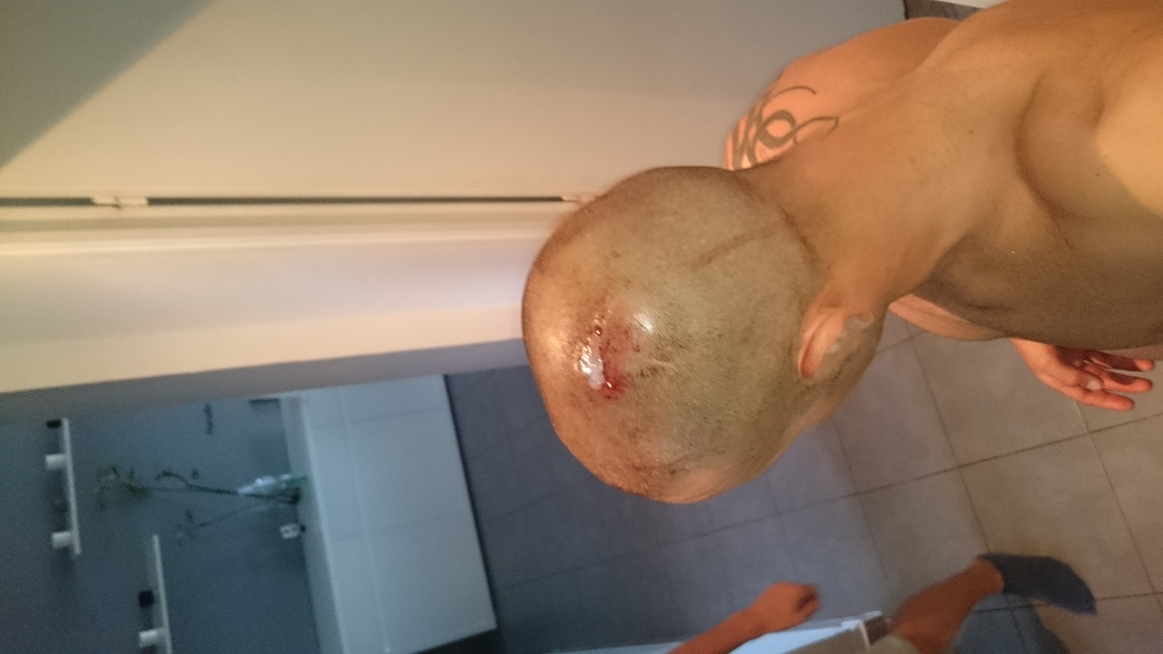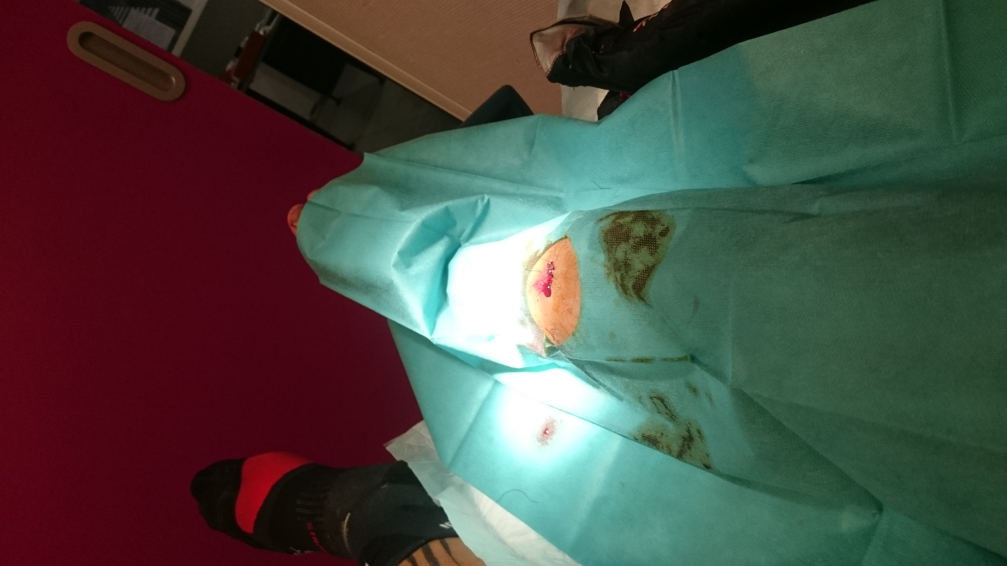 Puis me voilà arrivé aux voitures , l’équipe me propose de nettoyer la plaie de la tête mais quand je retire mes guêtres le tibia avait bien chargé! je pars donc en direction des urgences de Medipole! bilan pour 8 balises trouvées : 2 points au crâne et 5 au tibia!